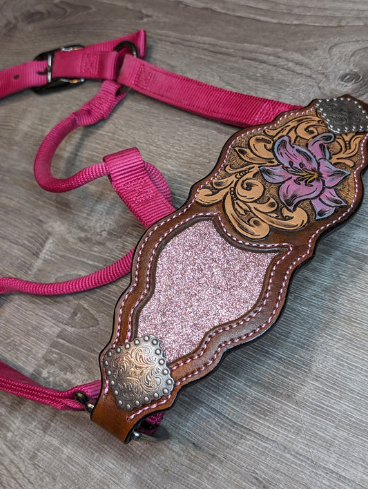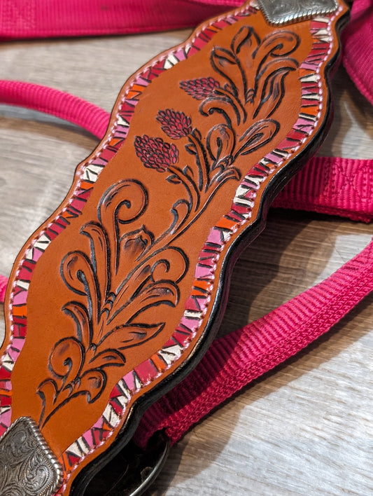 Pink Nylon Halter with Bronc Noseband, tooled with Indian Paintbrush