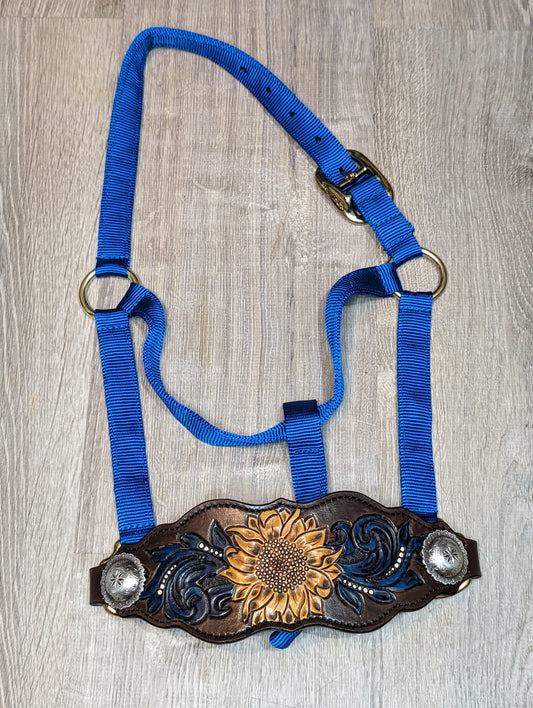 Sunflower and swirl tooled noseband on Royal Blue Nylon Halter