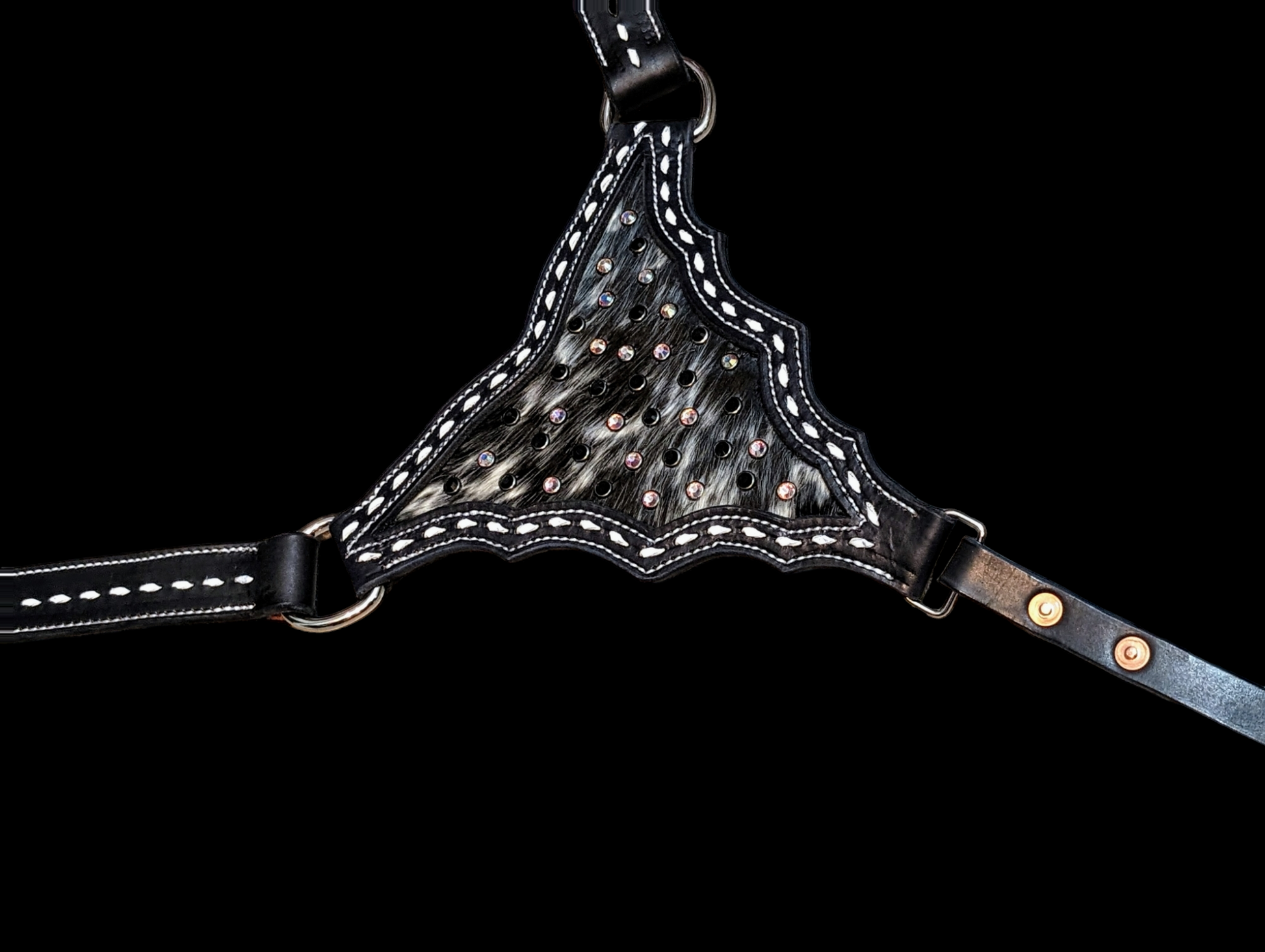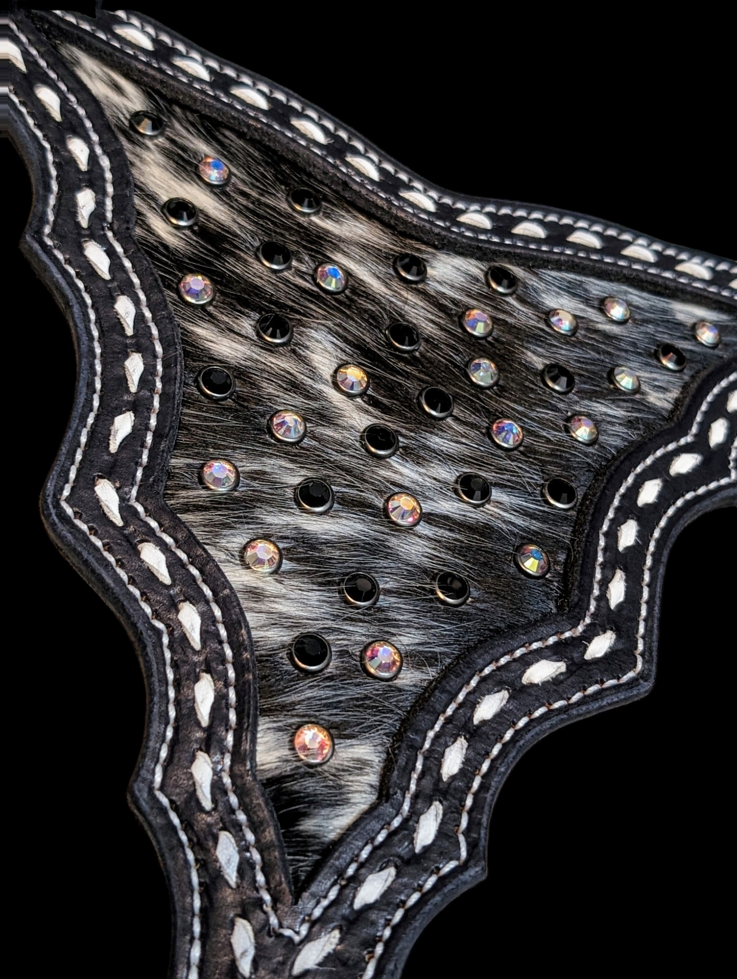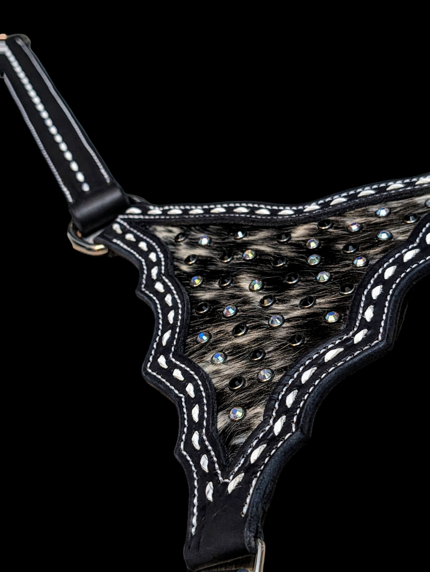 Show stopping gladiator style breast collar. Salt and pepper inlay, covered in AB Crystal and Jet Swarovski crystals. White kangaroo buck stitch around the center and along the wings of the breast collar.