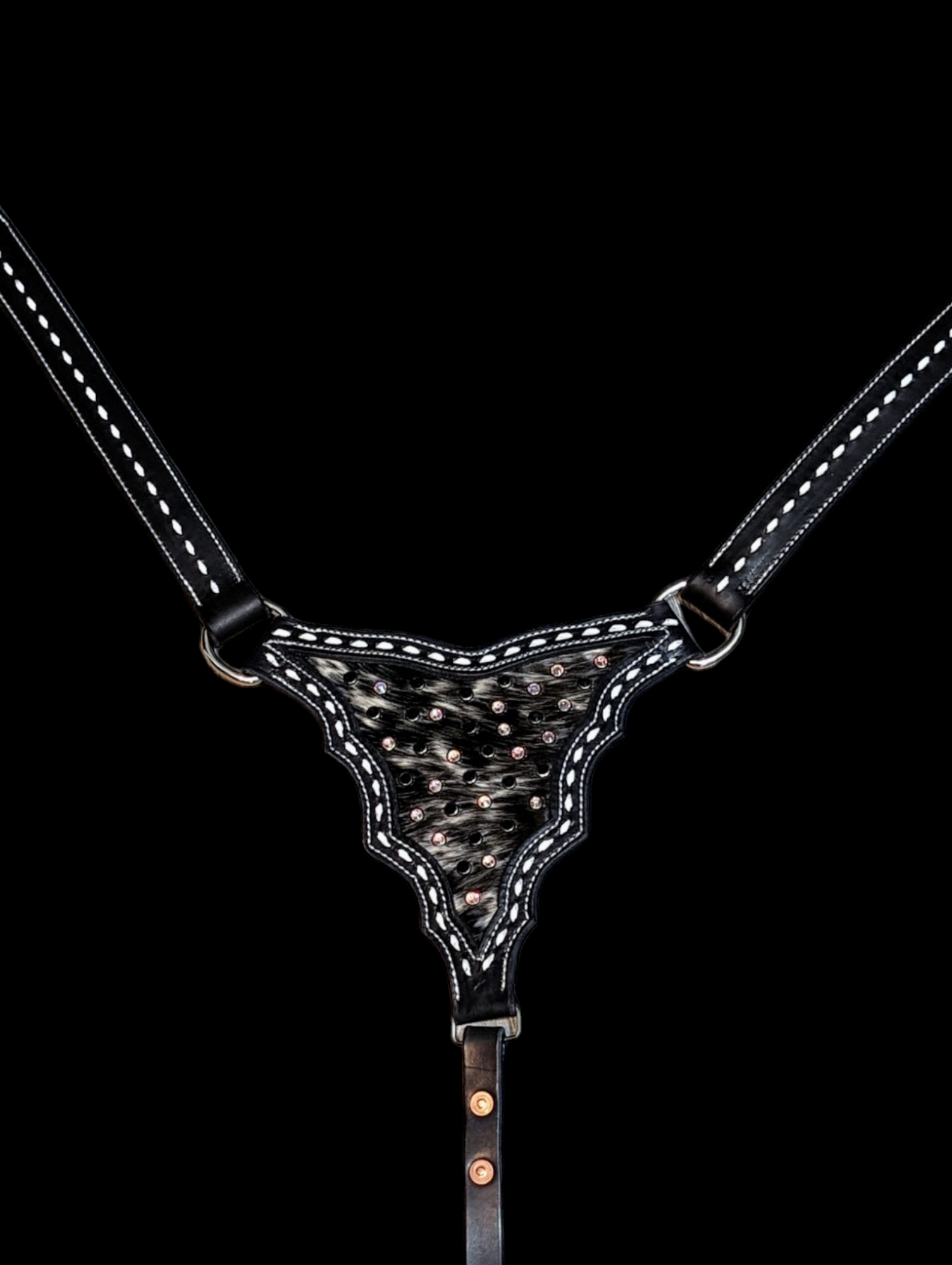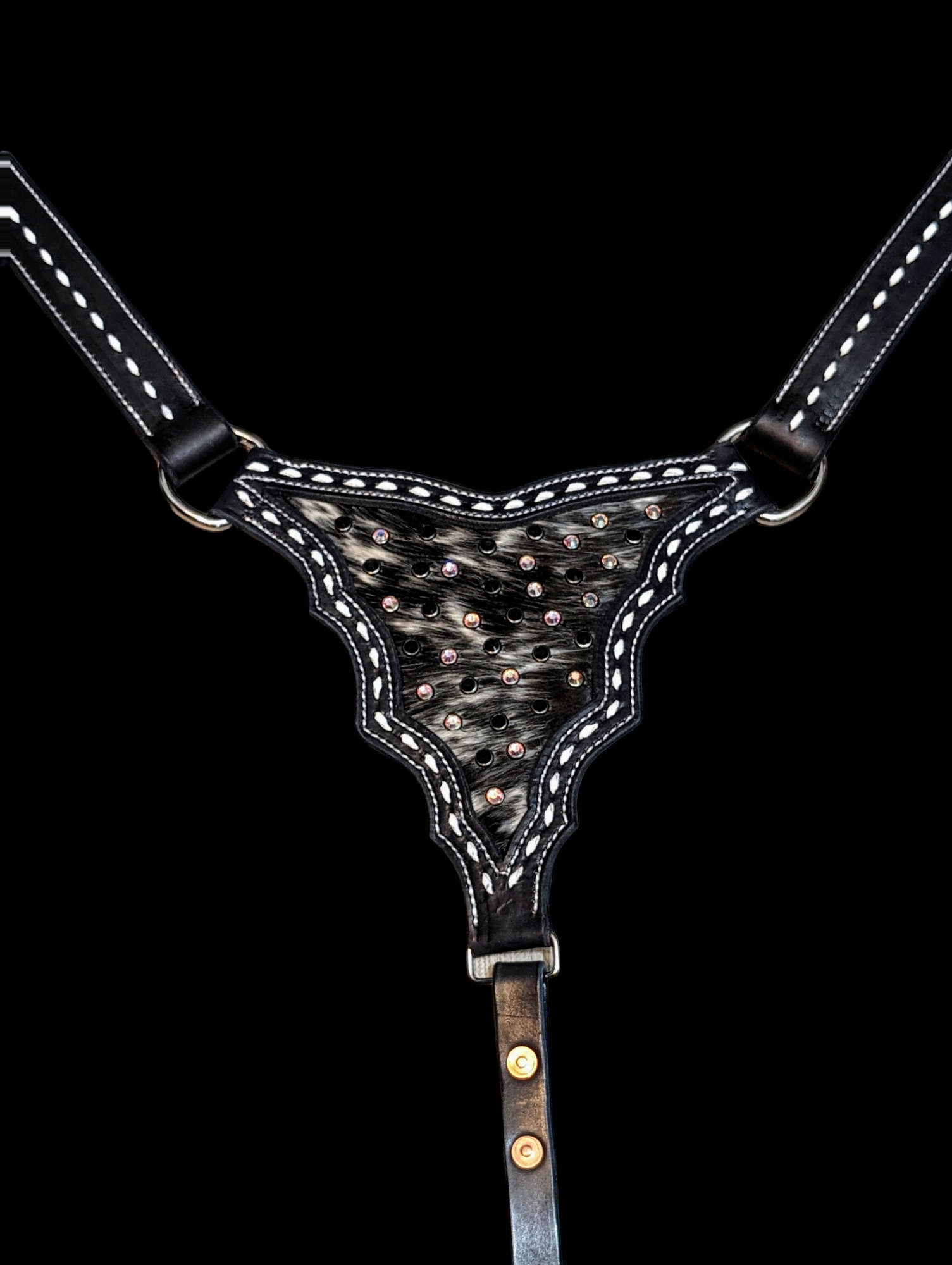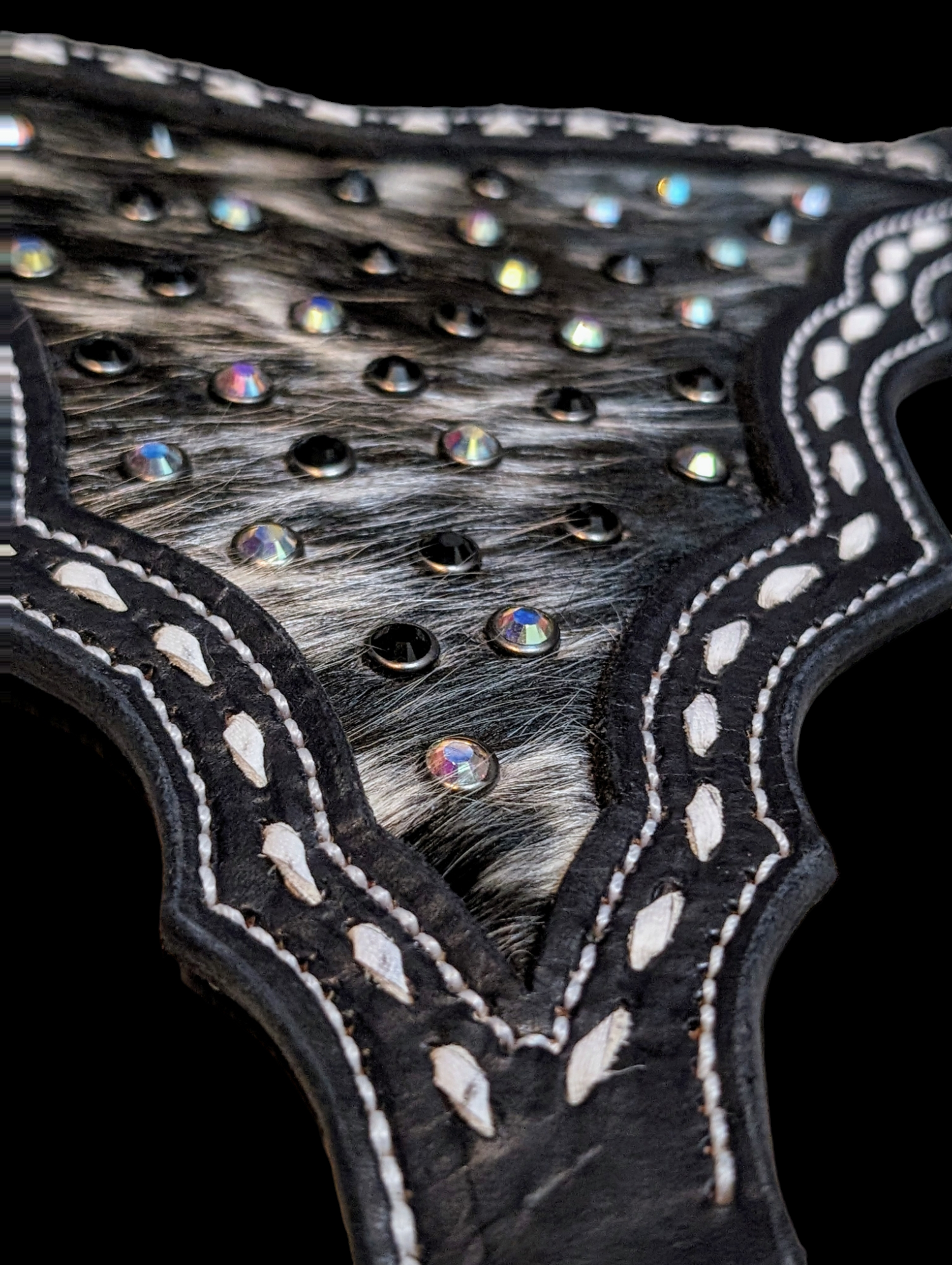 Show stopping gladiator style breast collar. Salt and pepper inlay, covered in AB Crystal and Jet Swarovski crystals. White kangaroo buck stitch around the center and along the wings of the breast collar.