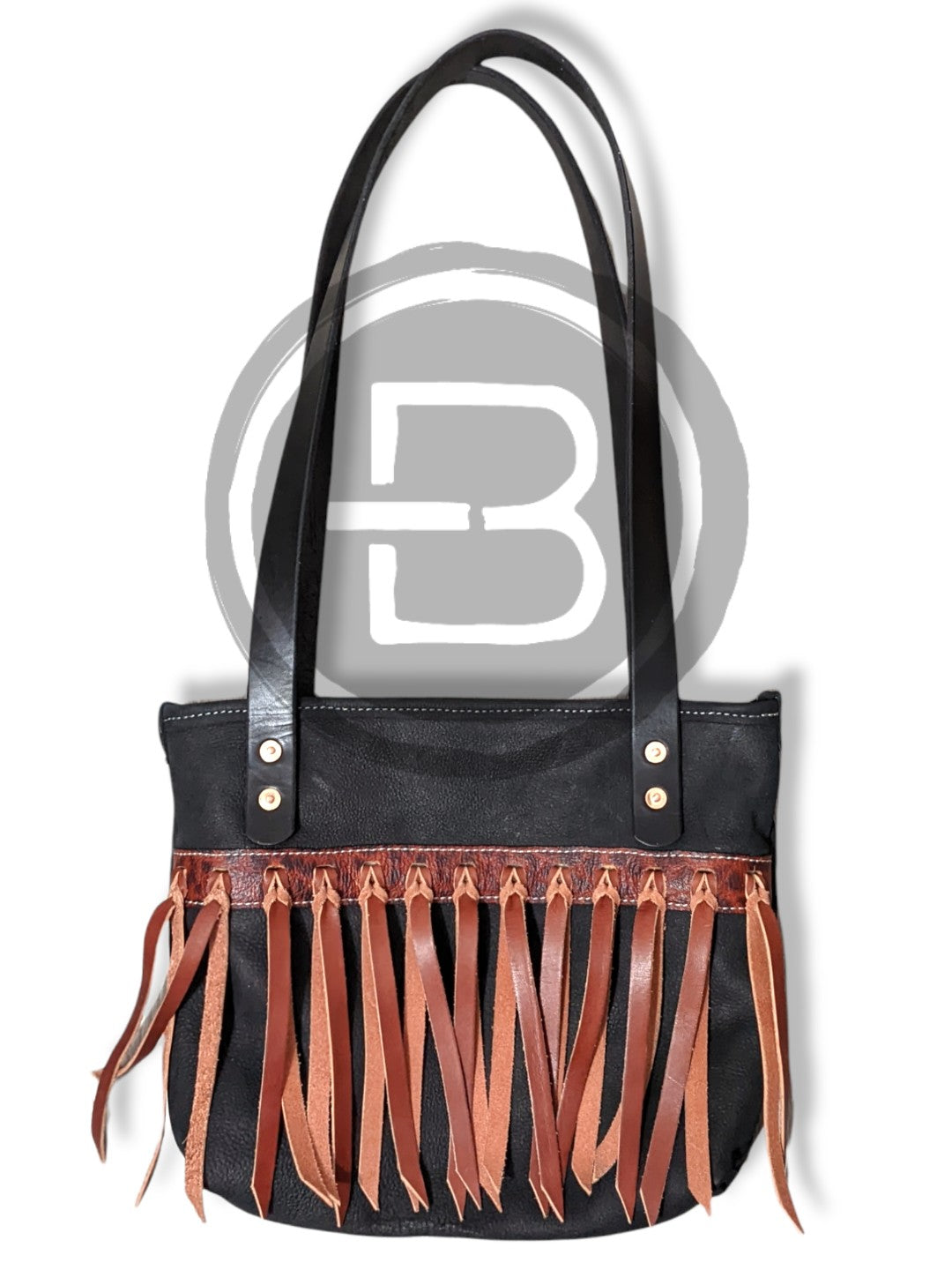 Canvas lined tote bag with bison leather accents and interior pockets and with Blood knot fringe.