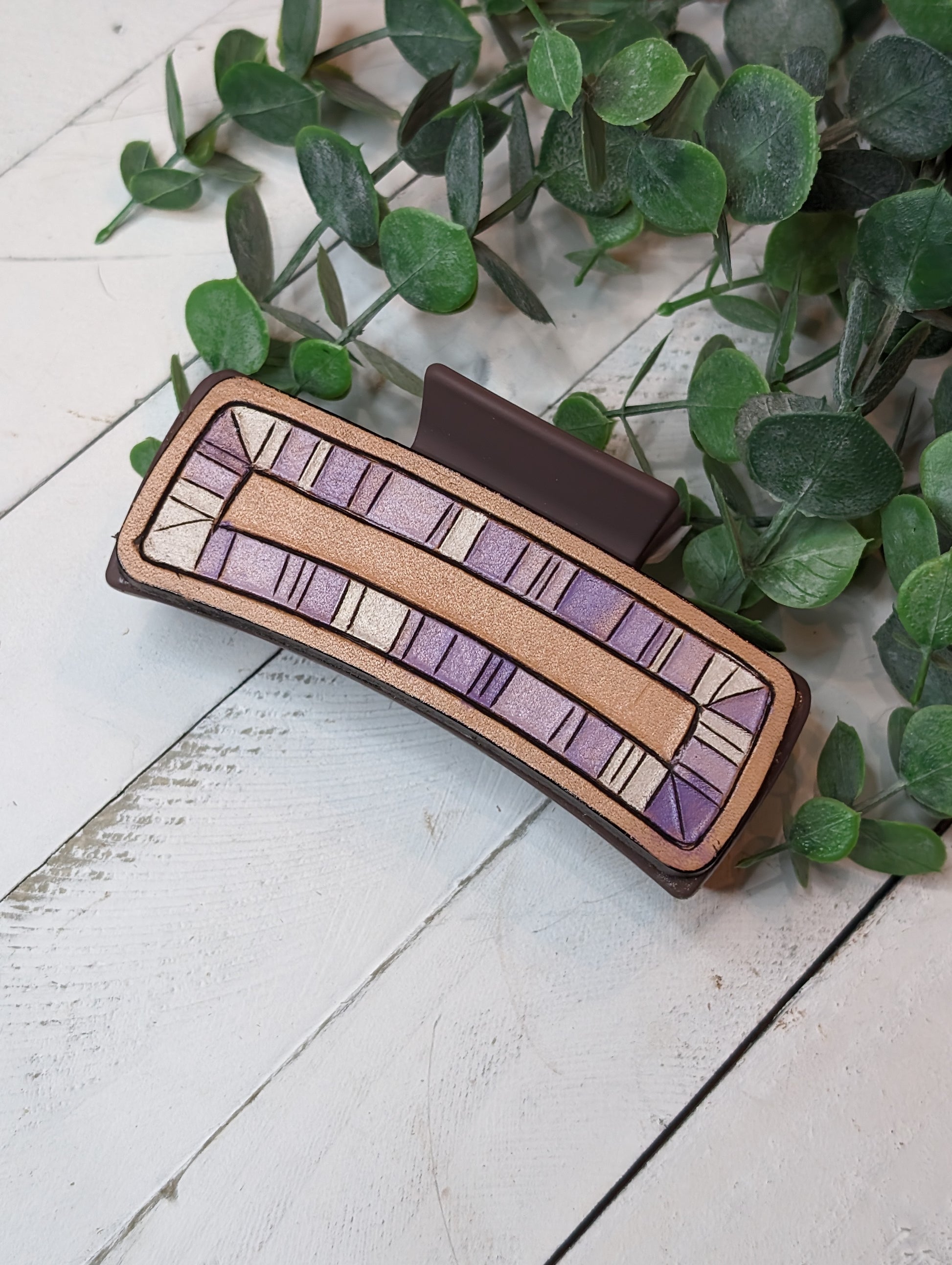 Purple border hand carved veg tag leather on a claw clip