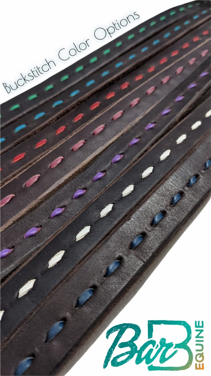 This is a listing for a made-to-order Bar B Leather & Tack one ear buckstitch dark oil headstall. You have an option to choose from in-stock buckstitch colors. These headstalls will have a tie closure for the bit and include a stainless steel buckle. This may take up to 4 weeks to fulfill!