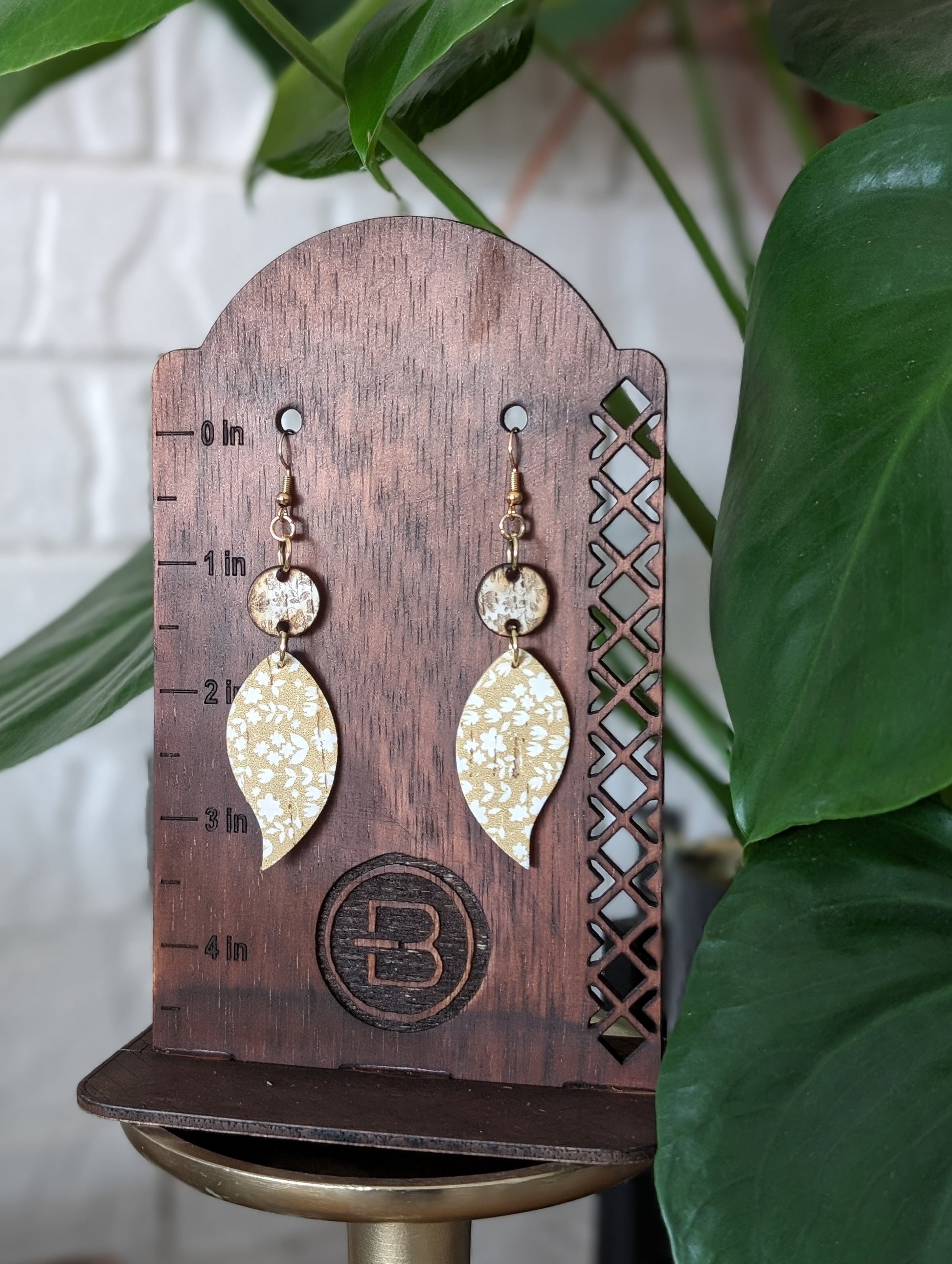 Yellow Cork on Leather Earrings with Wooden Connector. Sterling silver plated fish hook ear wires.