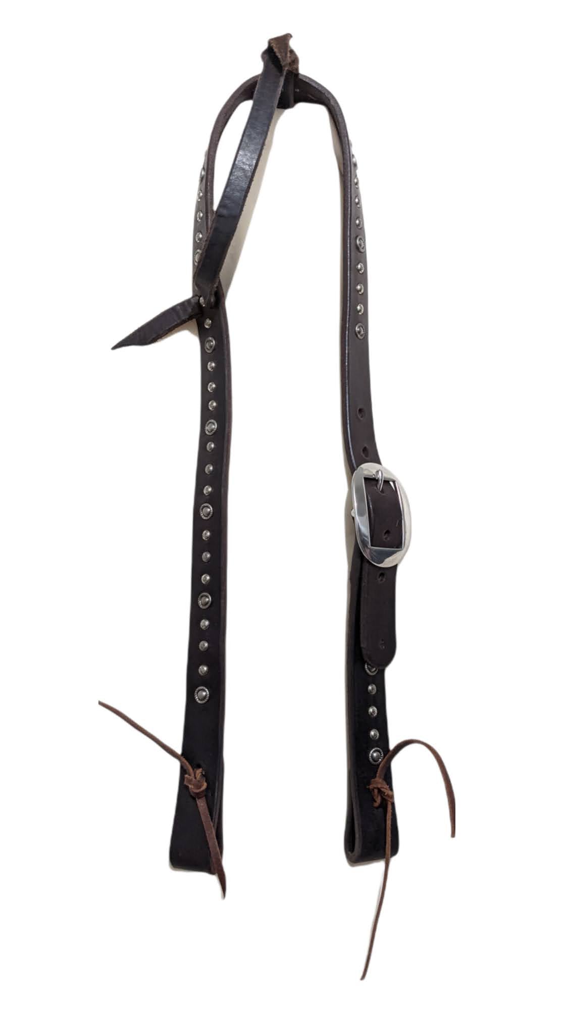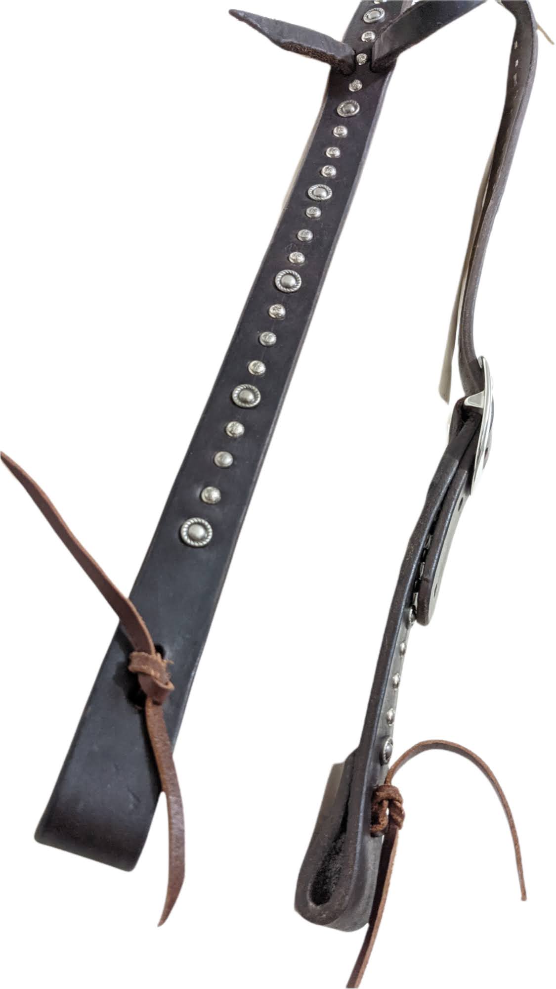 1" Wide Headstall made with 11-12oz Havana Bridle Leather with a one ear piece and covered in antiqued silver spots