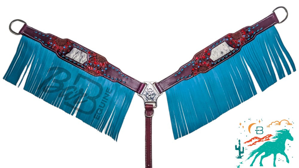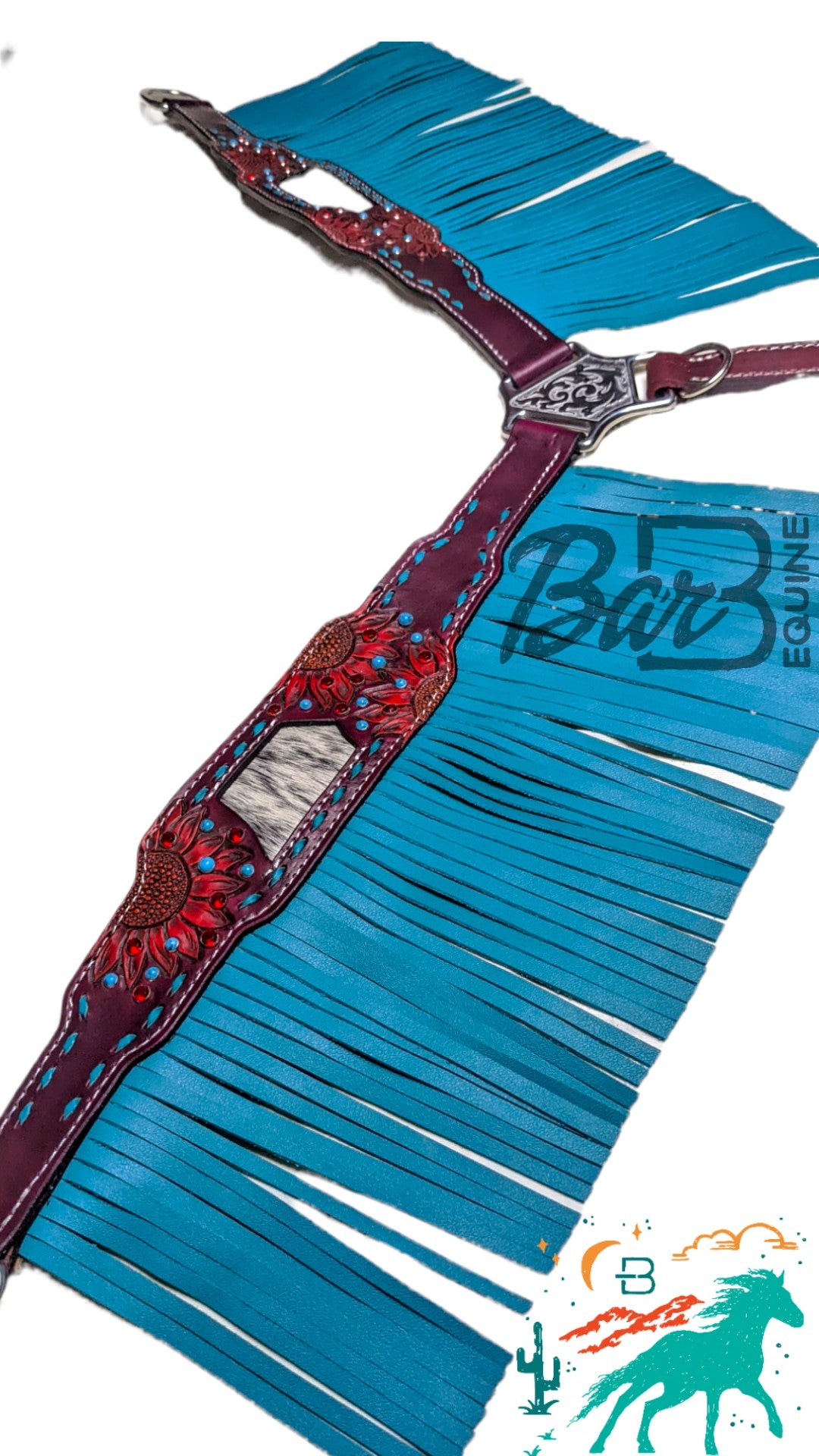 Hermann Oak leather, hand-tooled with sunflowers, adorned with turquoise stones and red rhinstones, hair-on hide inlay, buckstitched with turquoise kangaroo buckstitch, and finished with hand cut 6" turquoise fringe.