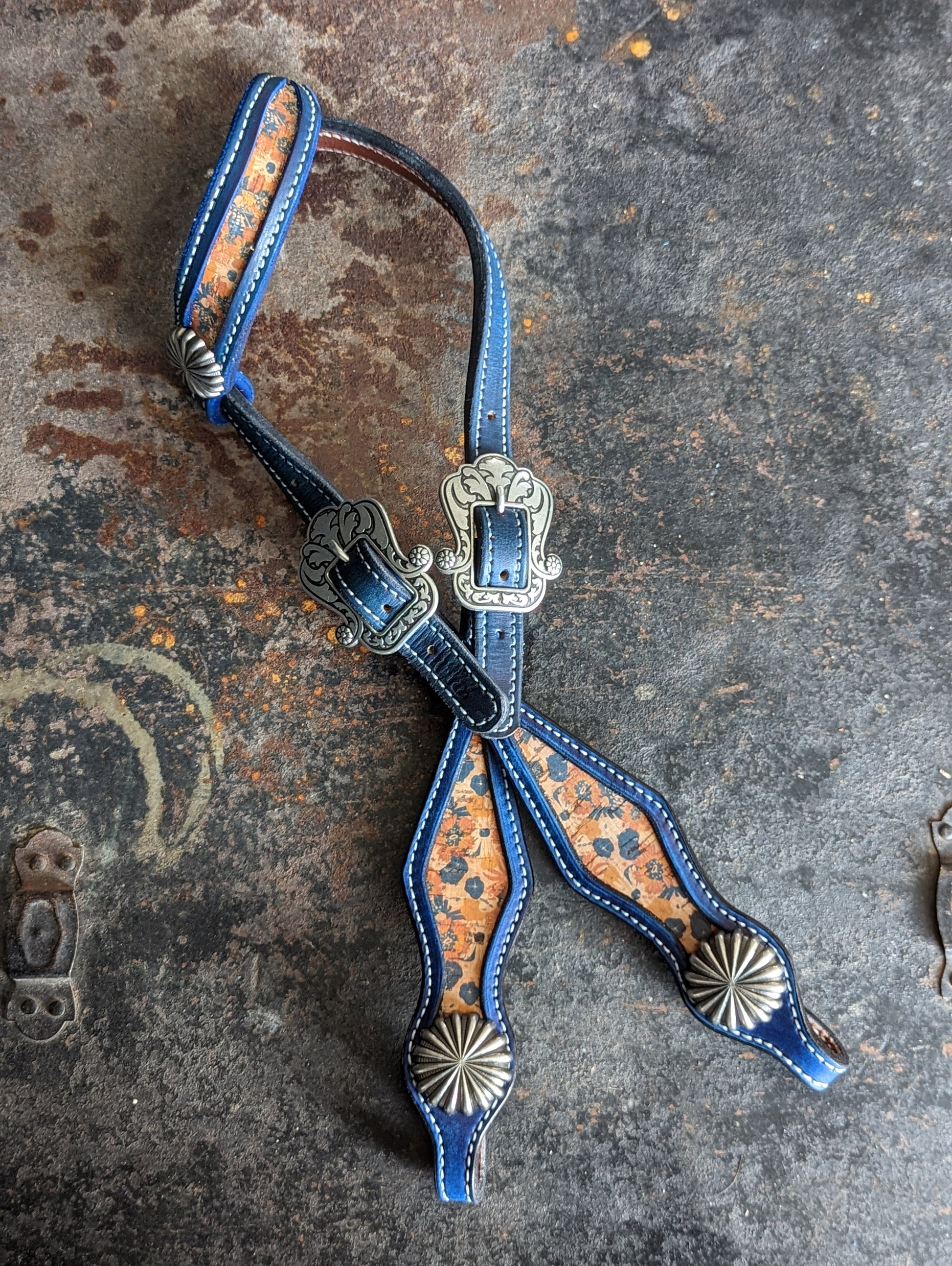 This beauty of this headstall FAR exceeded my expectations! Navy Leather with some intentional distressing and a floral orange and navy inlay.