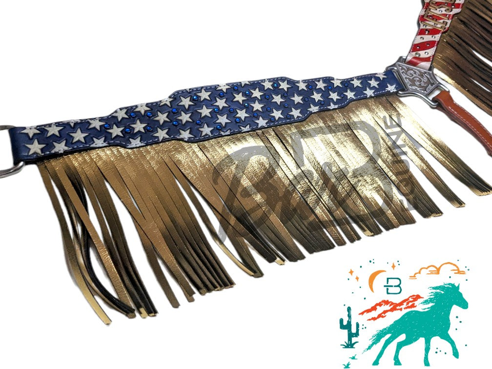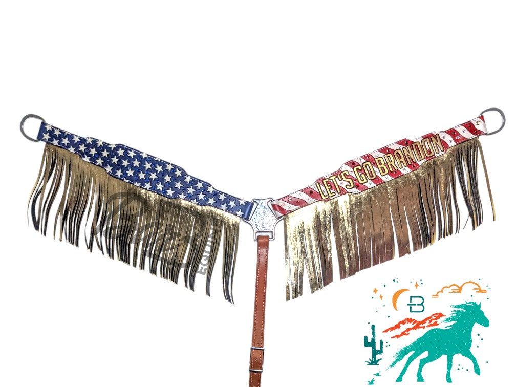 Hand tooled "LETS GO BRANDON" Breast collar with rimset rhinestones and gold metallic fringe. This thing SPARKLES.
