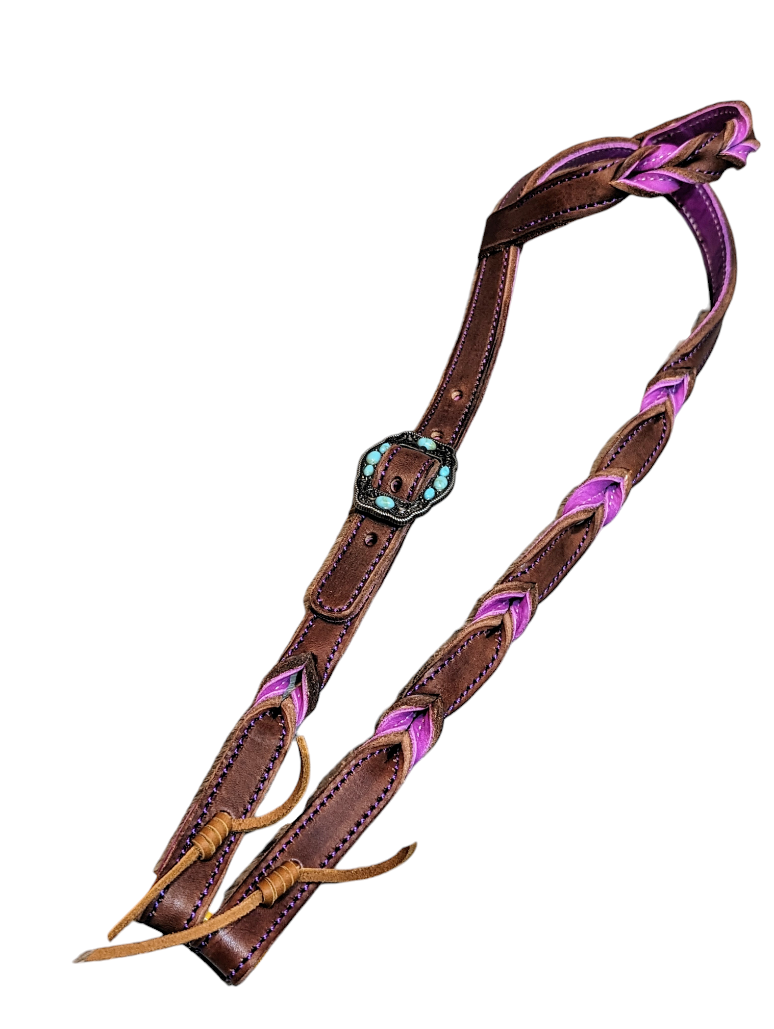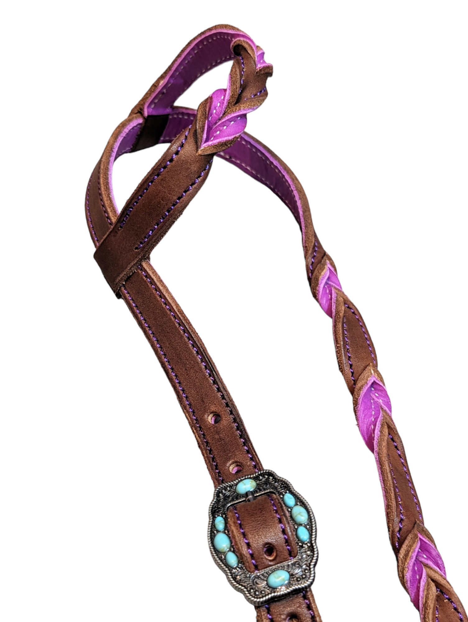 Dark brown headstall with a purple liner, purple stitching, and a buckle with turquoise stones!