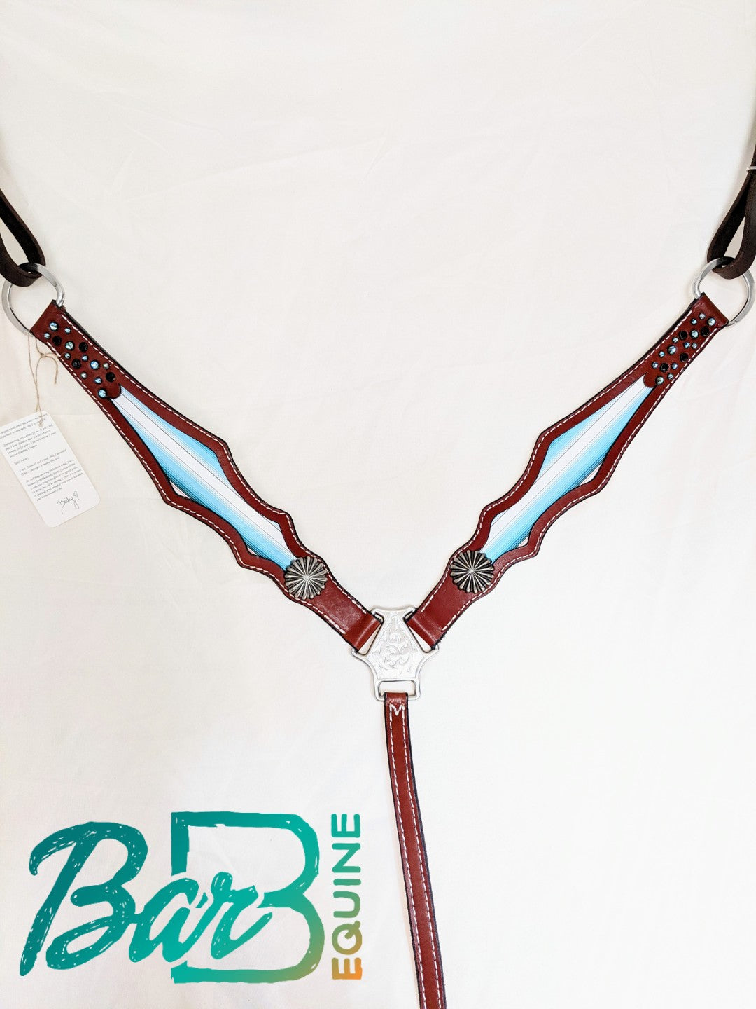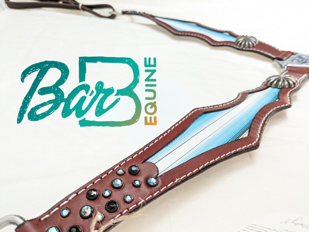 Sunset bridle leather with turquoise serape inlay. Swarovski crystals and spots dress this breast collar up.