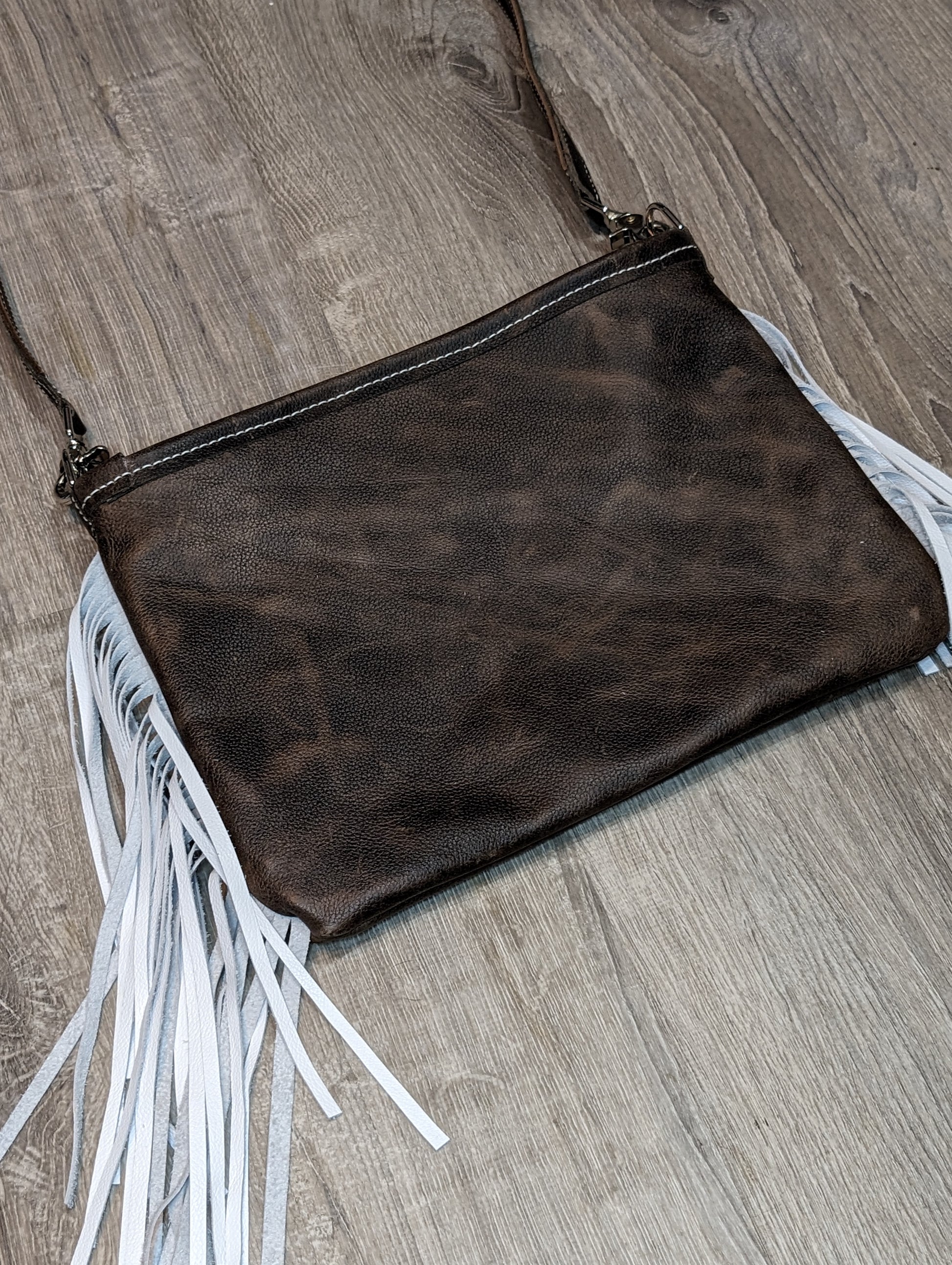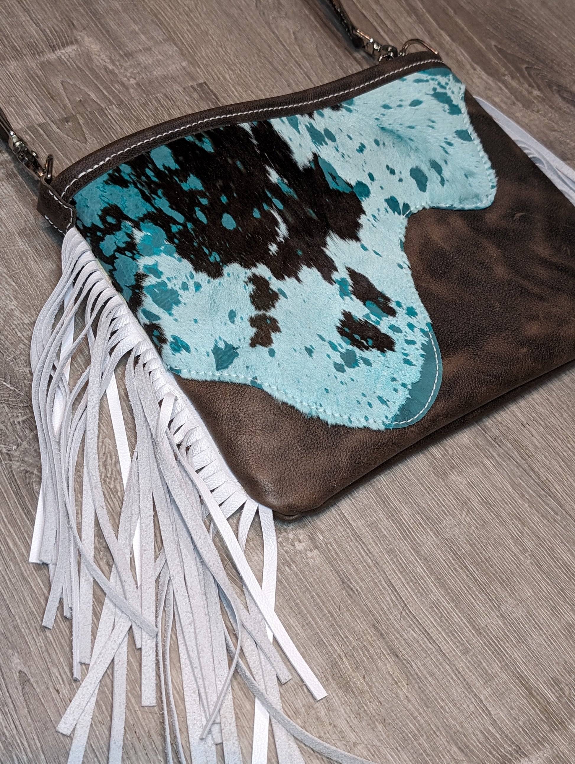 Unlined brown leather crossbody with turquoise and black acid wash cowhide and white fringe.